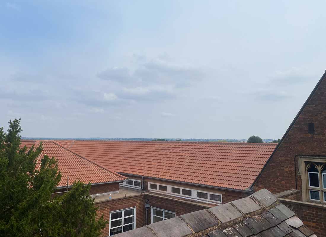 New clay tiled roofs, with hips and valleys, on private school buildings in Atherstone, Warwickshire.